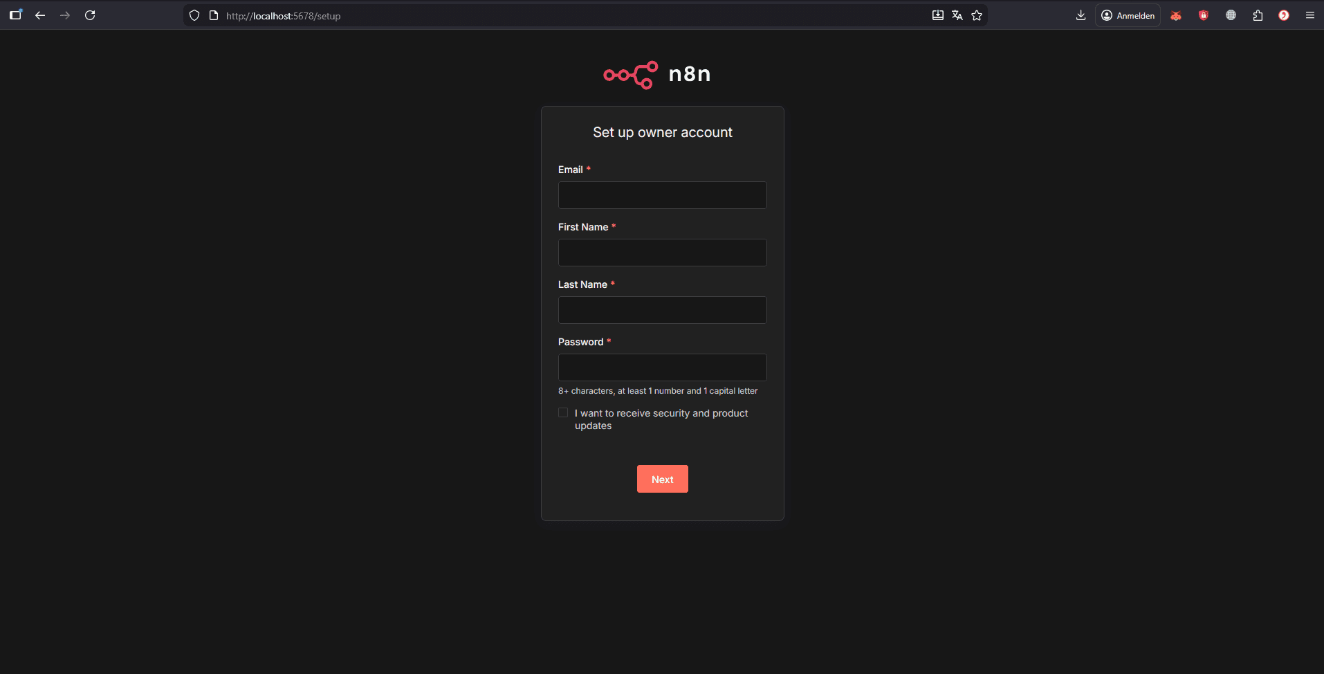 You should see the n8n setup screen.