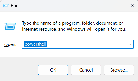 Run Windows + R shortcut to instantly open the Run dialog box. Type "powershell":