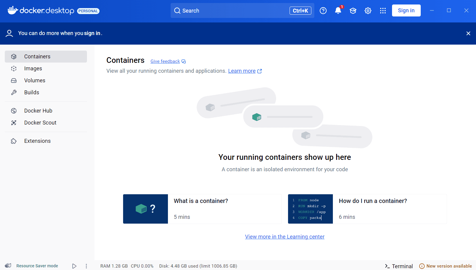 Open Docker Desktop from the Start Menu. If it asks you to sign in, skip it. You don't need to sign in to Docker to run it on your computer.