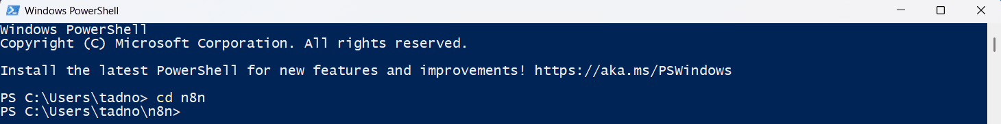 C:\Users\<yourusername>. Type cd n8n and you go to the n8n folder you just created: