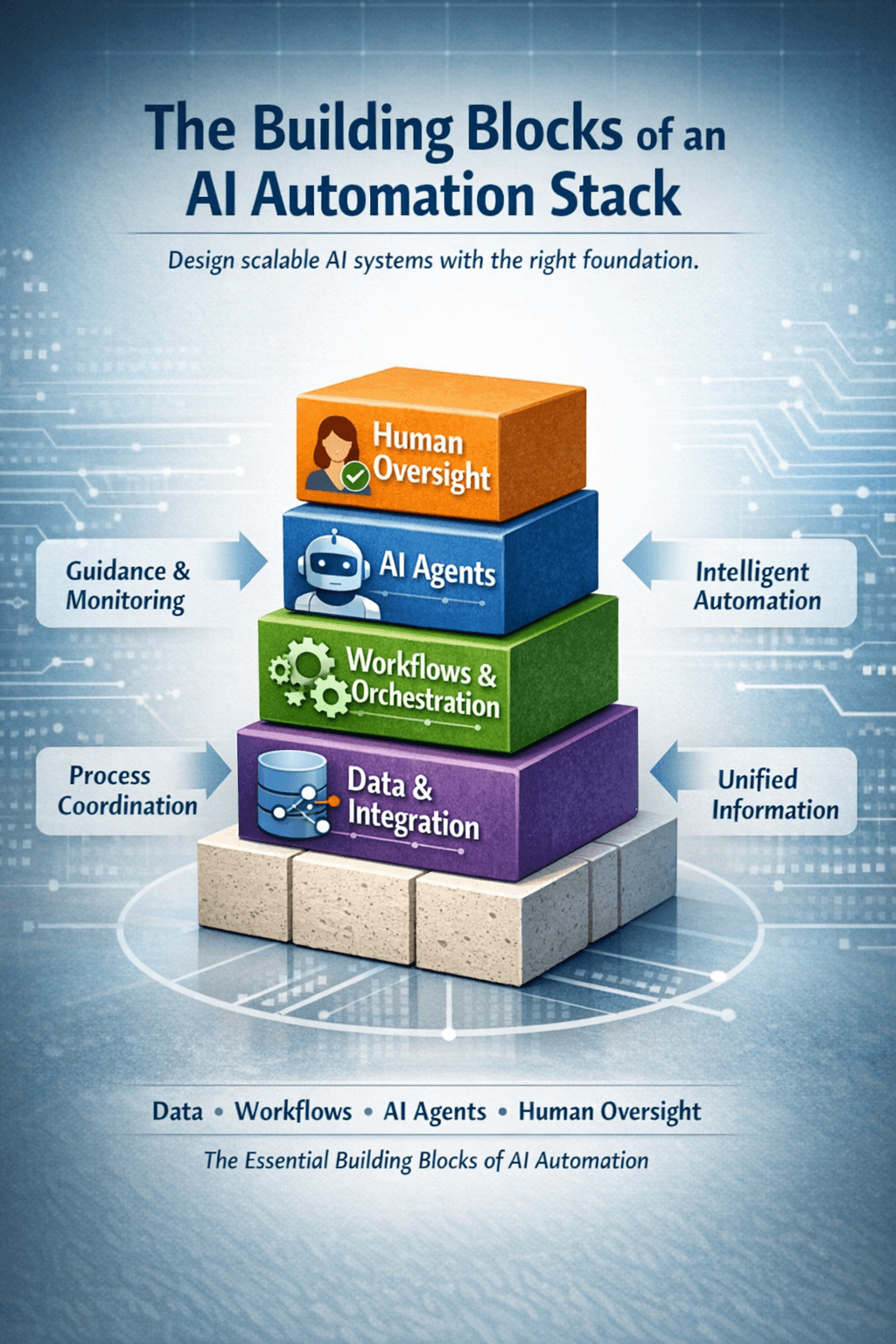 Learn the essential building blocks of an AI automation stack, from data and workflows to AI agents, orchestration, and human oversight.